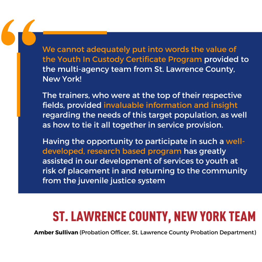 Please find below just a few of the testimonials from previous participants of the Youth in Custody Certificate Program. Within our vast Fellows Network, we are sure to have a team that is similar to your own; please don’t hesitate to reach out to us if you’d like to connect!